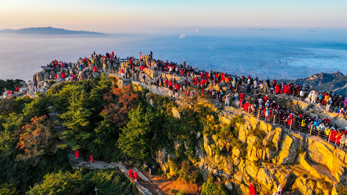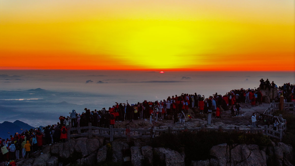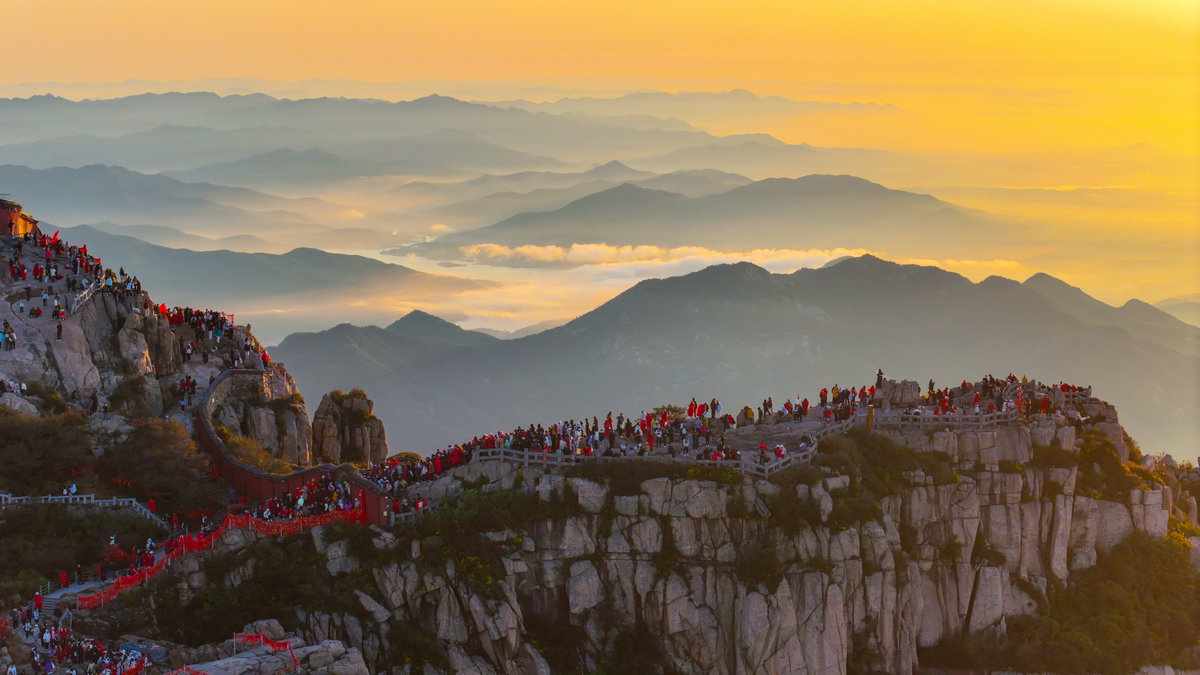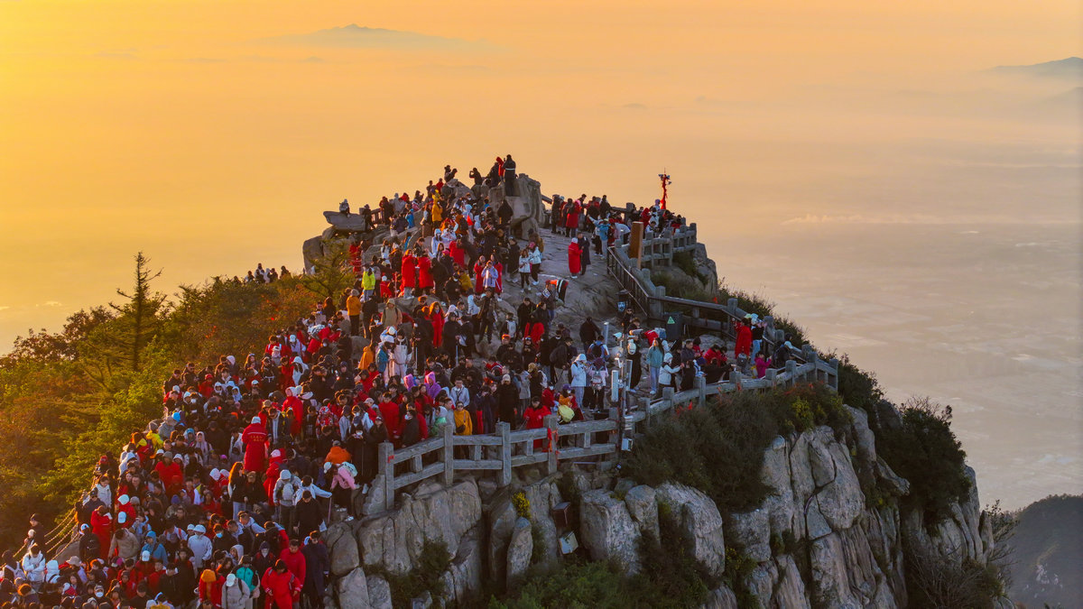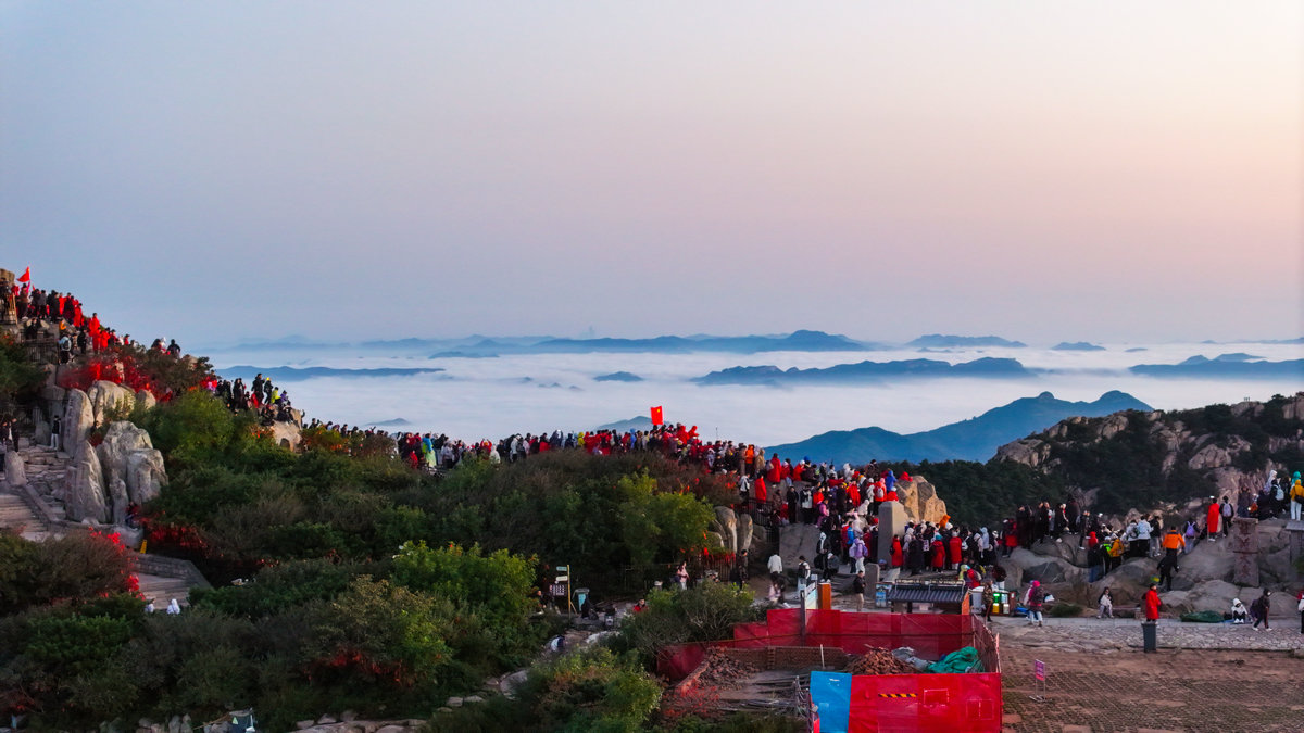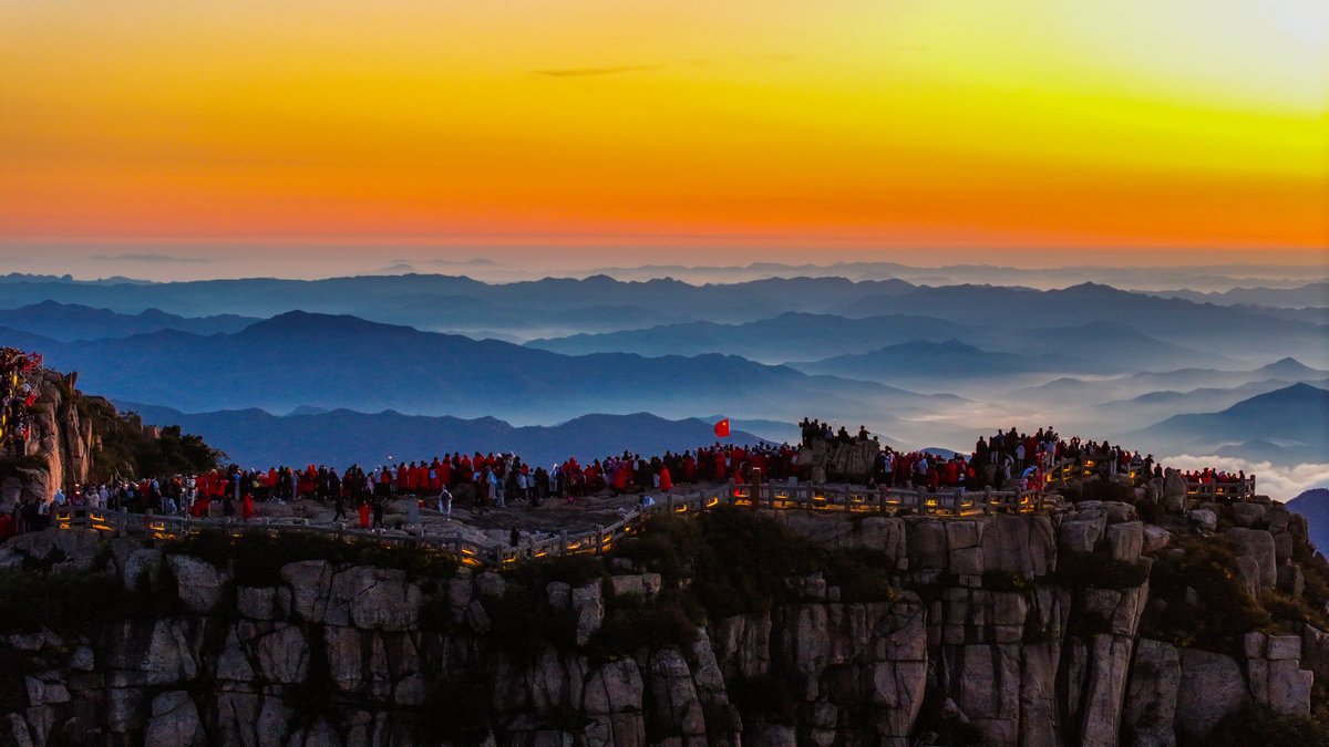 "越过高山,越过平原——" 歌声掠过拱北石,拂过唐摩崖,在历代帝王封禅告天的圣地上空回旋。此刻的日观峰不再是观景的平台,而成了巨大的天然音乐厅。有人眼角泛泪仍昂着头高唱,有人挽起陌生人的胳膊打拍子,所有人的目光都追随着东方那轮跃动的红日,仿佛正在见证一个民族与太阳同时升起。这突如其来的合唱比任何精心组织的仪式都更具震撼力。几个学生挥舞着红旗放声高歌,就连金发碧眼的外国游客也学着节奏轻轻鼓掌——他们或许不懂歌词,却一定能读懂此刻中国人脸上澎湃的情感。