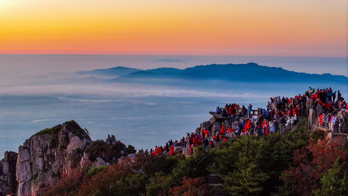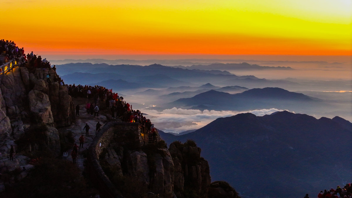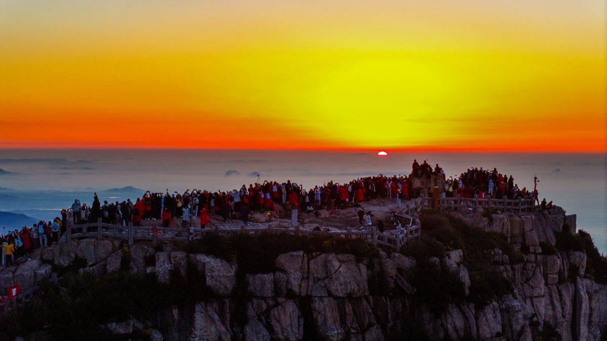 东天渐明的时候,日观峰、玉皇顶、瞻鲁台……所有面向东方的山石上已经挤满了游人。红色羽绒服裹紧的身体挨靠着,呵出的白气在空气中交织。没有人说话,所有的目光都投向远天那片青灰色的云线,仿佛整个世界的注意力都凝聚在那条细窄的缝隙之间。